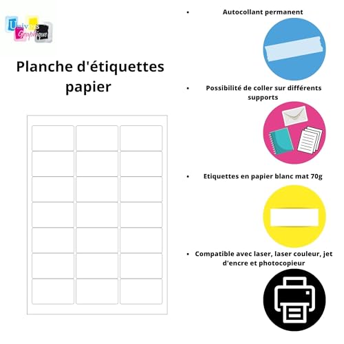 étiquettes adhésives. 33 étiquettes de 63.5 x 29.6 mm par feuille. Papier blanc et mat, pour imprimantes laser et jet d'encre---------- EXISTE PARLOT DE 10- 20-50- 100 et 500 planches RECHERCHEZ UGE27R02 SUR AMAZON
